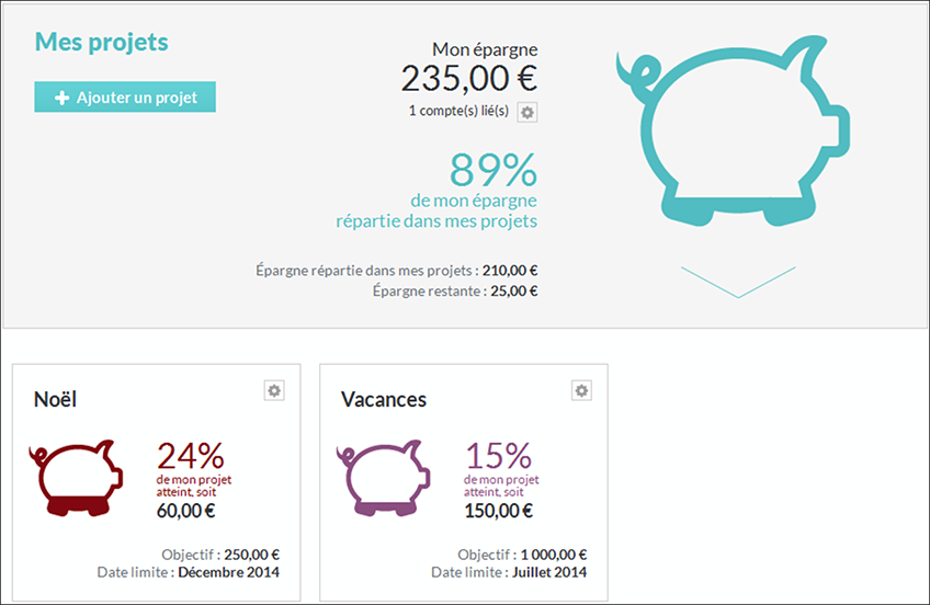 - Les différents projets disposent chacun d'un emplacement dédié sous le cadre principal. Il est possible de suivre l'évolution des économies réalisées pour chaque projet. Ici, avec 60 € économisés, le projet « Noël » que nous avons paramétré est actuellement complété à 24%.